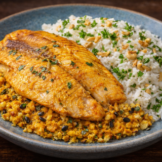 Tilápia com Farofa de Maracujá e Arroz de Coco e Castanha