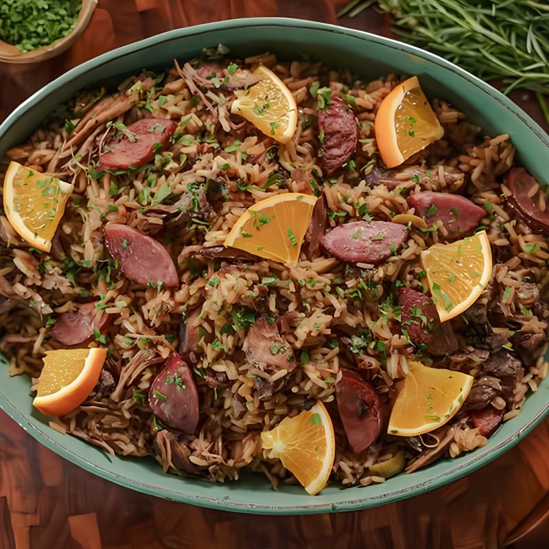 Uma receita rústica e sofisticada ao mesmo tempo, inspirada na tradição portuguesa. O pato é cozido com vinho tinto até absorver todos os aromas, e depois desfiado e misturado ao arroz úmido e perfumado com alho-poró, laranja, calabresa e azeitonas. Um prato intenso, marcante e cheio de personalidade.