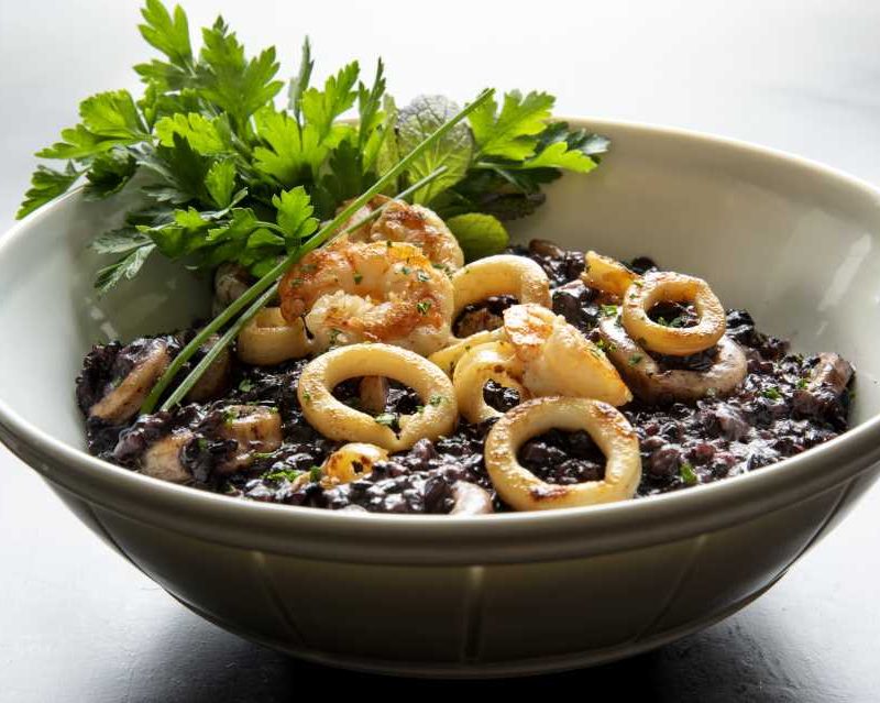 Elegante e mediterrâneo, este prato combina o sabor marcante do arroz negro — cozido lentamente até ficar levemente al dente — com lulas grelhadas no ponto perfeito. As notas cítricas do limão siciliano trazem frescor e leveza, realçando o sabor naturalmente adocicado dos frutos do mar. É uma receita sofisticada, leve e refrescante, ideal para dias quentes e para quem busca uma experiência de verão com alma italiana.