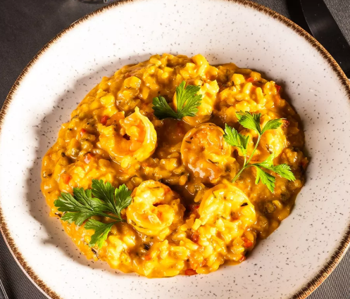 Uma fusão irresistível entre a cremosidade do risoto e os sabores intensos da moqueca. O arroz é cozido lentamente em um caldo aromático de leite de coco, tomate, pimentões e coentro, criando uma base rica e envolvente. Finalizado com camarões grelhados no ponto perfeito, trazendo textura e suculência ao prato.