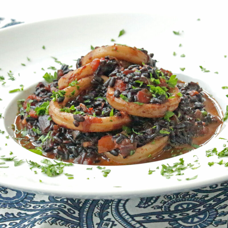 Hummmm!! Que receita deliciosa. Arroz negro cremoso acompanhado de lulas cozidas no vinho branco!! Simplesmente sensacional