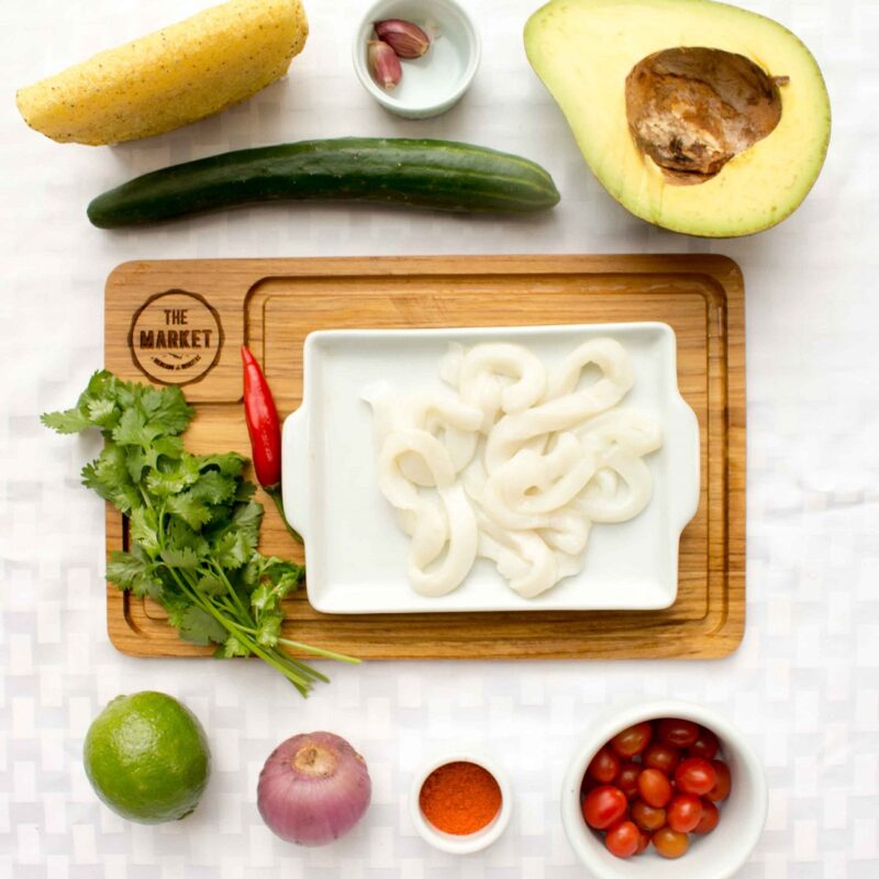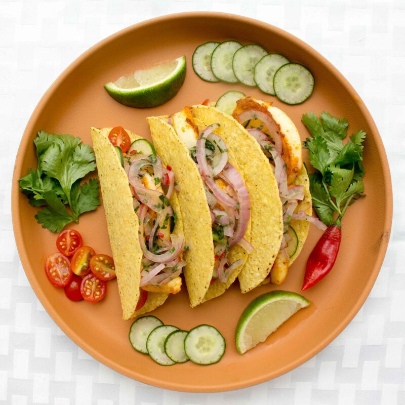 Tacos de Lula com Abacate, Salsa Picante e Pepinos